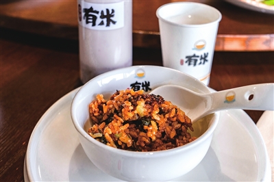 除了土灶菜饭,餐厅还研究出许多大米新吃法。由大米酿制的碳酸饮料大米汽水,喝起来清爽怡人,有米酒的味道但不含酒精。到餐厅斜对面的有米茶点逛逛,会发现更多大米为原料的甜点茶饮,其中米奶茶是新晋网红饮品,以米浆、茶叶和牛奶为基底,其中加入了薏米爆珠,口感丰富,还有米布丁、米蛋糕等甜点。在点餐前,可以带一杯米奶茶或者一块蛋糕到餐厅,一次性品尝大米的“千滋百味”。