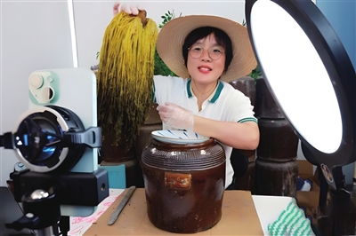 三年前,蒋瑜佳还是大城市互联网从业者。如今,线上直播间里,她常戴一顶宽边草帽,左手边放着腌菜坛、右手拎一颗雪菜,向观众推荐家乡特产。