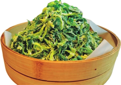 先将香椿焯水去除亚硝酸盐,然后弄成小段后和玉米粉、大米粉混合,让每个叶片上都沾满面粉,蒸锅上汽后蒸8分钟即可,可以蘸喜欢的调味汁一起吃。