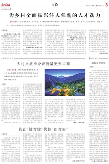 广开渠道引才,打造人才集聚“新高地”。乡村全面振兴,离不开“新鲜血液”的注入。一方面,要广开“贤”路,按照“缺什么、补什么”的思路,因地制宜延伸人才引进工作触角,拓宽人才发现渠道,量身打造人才引进清单,靶向引才。另一方面,要积极出台一系列具有吸引力的人才政策,针对乡村产业发展需求,精准引进农业科技、电商运营、文旅开发等领域的专业人才。同时,实施“乡贤回归工程”,建立在外人才数据库,通过举办乡村全面振兴人才招聘会、线上引才推介会等活动,搭建起人才与乡村对接的桥梁,引导资本、技术、理念同步回流,让人才资源切实转化为乡村全面振兴的强大动力。