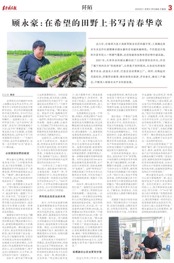 顾永豪是幸运的,乡村振兴让家乡面貌焕然一新,也让他对农业产业的未来充满希望。在自己的家乡,在沪郊乡村热土上,他不断探索农业新业态,努力实现一个“00后”新农人的乡野愿望。“我想把我的所思所学更好地应用在农业上,吸引更多像我一样的年轻人投身到新型职业农民的行列,在农村土地上创造更多价值。”顾永豪说出自己的愿景时,青涩的脸庞充满自豪和期待。