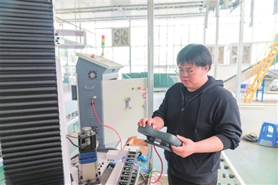 2024年,顾永豪在合作社里打造了一座现代化自动育秧工厂。一眼望去,看到的是由四条机械臂、一条流水线、一台洗盘机、一台水稻自动加种机和八台多层循环运动式育秧设备组成的复杂系统。每台育秧设备高5.5米,共10层,仅一台设备单次就可育秧1500盘,足够覆盖500多亩水稻田。“目前合作社稻田约500亩,只需一次育秧即可全部完成。”顾永豪说。经过一年多的摸索,他对于育秧工厂的流水线速率、内部温度湿度、灯光数据的调节以及机械臂的调试都更为精准、娴熟。“育秧周期缩短后,合作社每年能服务的水稻面积也能够增加到3000亩左右,这样就能为更多农户提供育秧服务。”